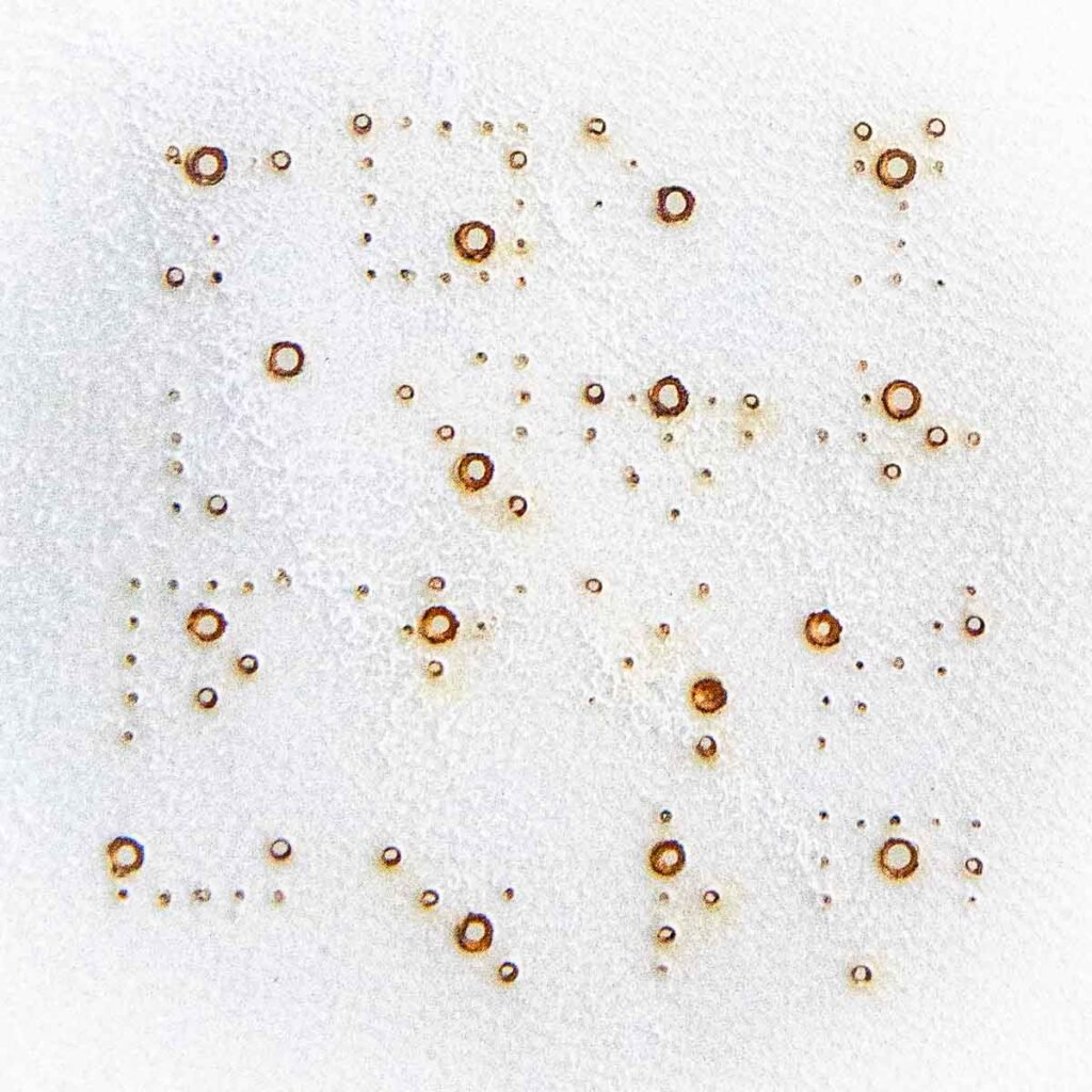 Scripture perforée. Fontes, cribles et scories, assemblées en rhombes.