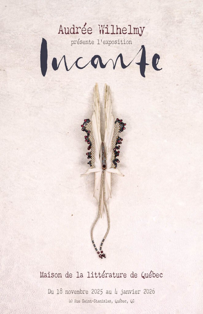 Dans le cadre de l’exposition présentée à la Maison de la littérature, Audrée Wilhelmy propose un atelier de trois heures où l’écriture et le geste se rencontrent. À partir du texte « Je rends », issu de son livre Incante, les participantes et participants seront invité·e·s à réfléchir à ce qui les traverse — ce qui pèse, ce qui protège, ce qui doit être transmis ou laissé — puis à traduire cette matière intime en forme concrète.